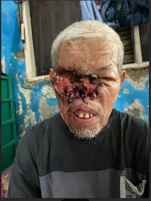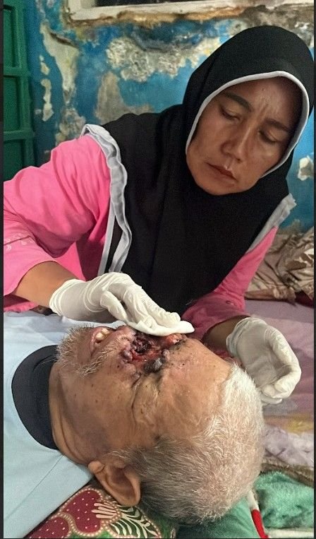 Itulah kepedihan yang kini dirasakan Abah Jari (72 tahun). Bukan karena ia tak pantas, tapi karena kanker ganas di wajahnya mengeluarkan bau tak sedap dan darah yang terus menetes.