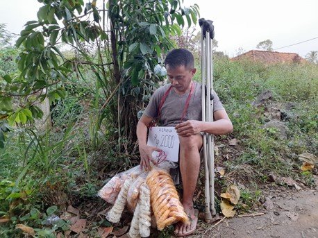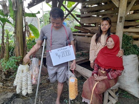 Untuk memenuhi kebutuhan sehari-hari, Pak Yayan berjualan kerupuk keliling kampung. Karena hanya ini yang bisa Pak Yayan lakukan. "Kaki palsu saya udah patah dibeberapa bagian. Kalau dipakai rasanya sakit banget dan gampang terjatuh. Jadi terpaksa saya keliling harus pake tongkat ini." ~Ungkap Pak yayan