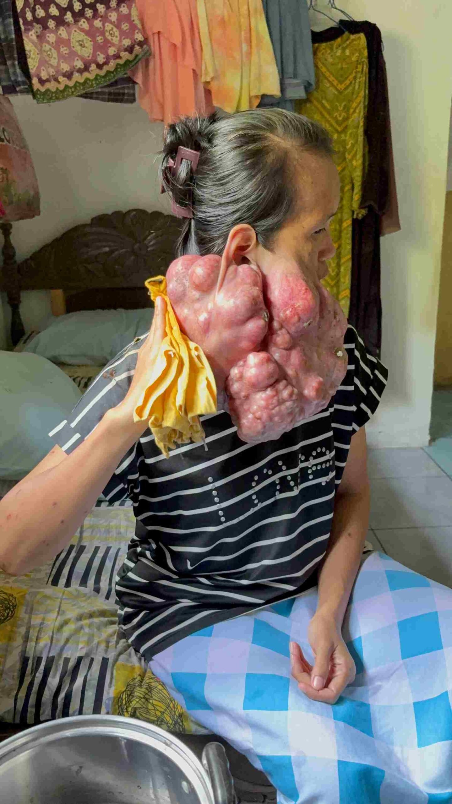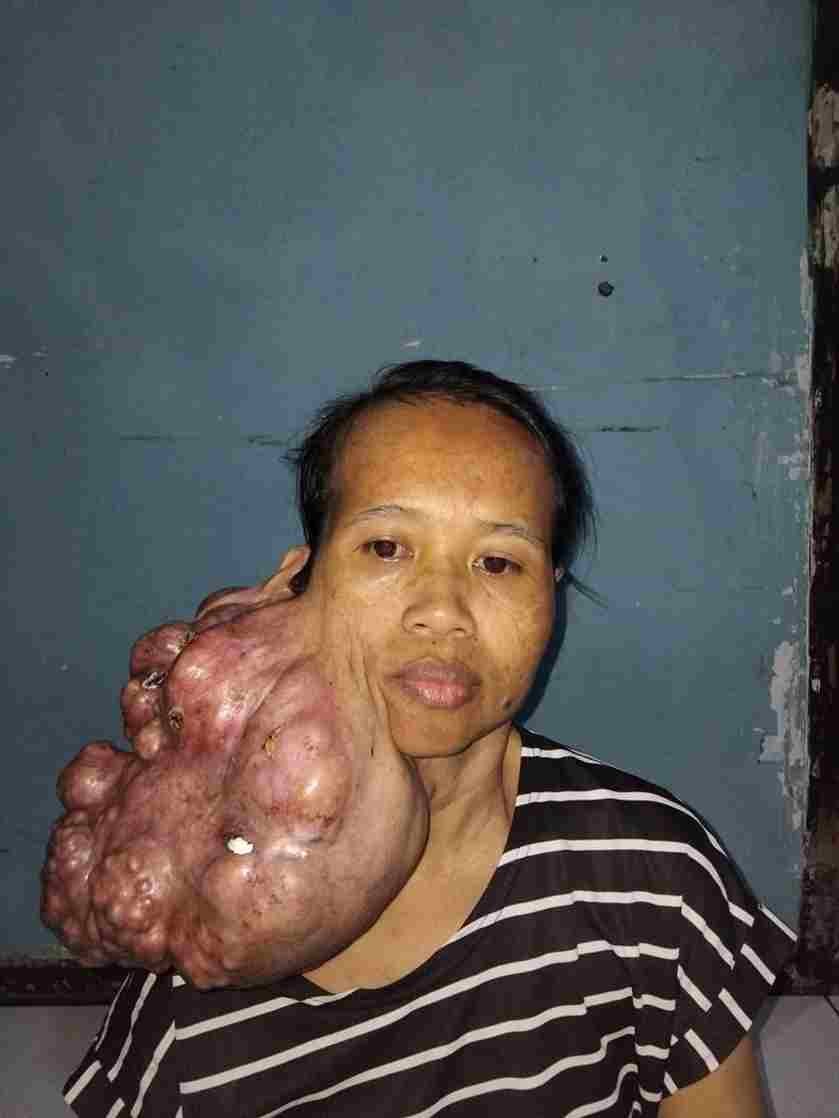 Bu iyus namanya (41 th) yang saat ini sedang berjuang melawan tumor pipi yang semakin membesar sebesar bola basket. Rasa sakit yang amat sangat,perih dan panas pada benjolan tumor bu iyus terus dirasakan,apalagi saat meradang.